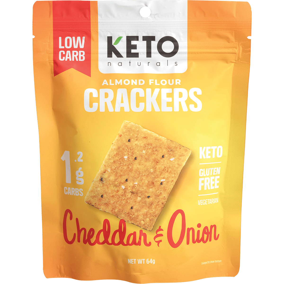 Ingredients: Almond Flour (15%), Resistant Starch (Tapioca), Egg White, Resistant Starch (Rice), Cheddar Cheese (10%) (Milk, Salt, Enzymes, Annatto (Colour)), Butter (Cream [Milk]), Coconut Cream, Soy Protein, Coconut Oil, Nutritional Yeast, Xanthan Gum, Sesame Seeds, Flax Seeds, Baking Powder, Salt, Paprika (Colour), Onion Powder (0.3%), Black Pepper, Rosemary, Garlic Powder.
