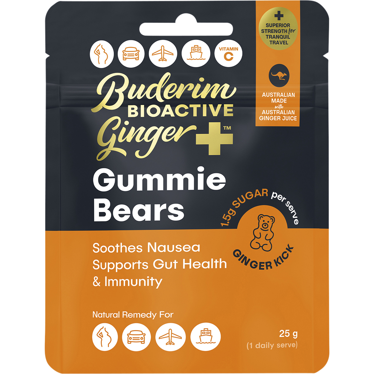 Ingredients: Maltitol, Polydextrose, Ginger 5.1% (Australian Ginger Juice, Ginger Oleoresin), Australian Sugar, Pectin, Acidity Regulators (330, 331), Glycerine, Acerola Cherry Powder (Vitamin C), Australian Postbiotic Type Probiotics (L. Acidophilus, L. Plantarum), Coconut Oil, Carnauba Wax.